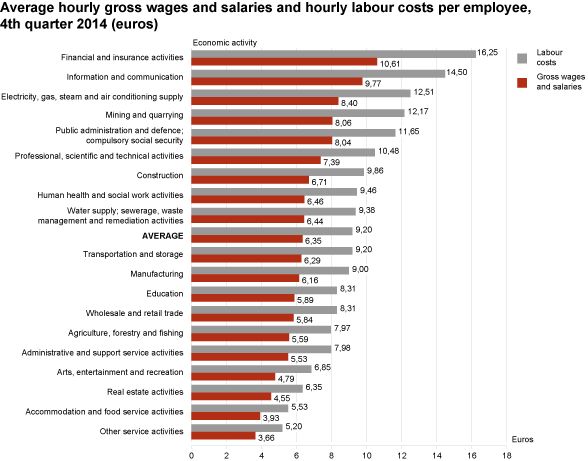 The average monthly gross wages and salaries rose in all economic activities in the 4th quarter of 2014. Compared to the same quarter of the previous year, the average gross monthly wages and salaries grew the most in financial and insurance activities (12.5%) and the least in information and communication (0.5%). In the 4th quarter of 2014, the average gross hourly wages and salaries increased the most in financial and insurance activities (13.1%) and fell only in information and communication (0.2%).
