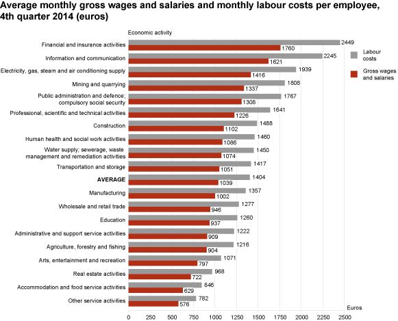 In the 4th quarter of 2014, the employer’s average monthly labour costs per employee were 1,404 euros and the hourly labour costs were 9.2 euros. Compared to the 4th quarter of 2013, the average monthly labour costs per employee increased by 5.1% and the average hourly labour costs by 5.9%. The largest increase occurred in financial and insurance activities (12.8% per month and 14.8% per hour). The smallest increase in average monthly labour costs per employee occurred in information and communication (0.5%). The hourly labour costs per employee fell only in information and communication (0.9%).