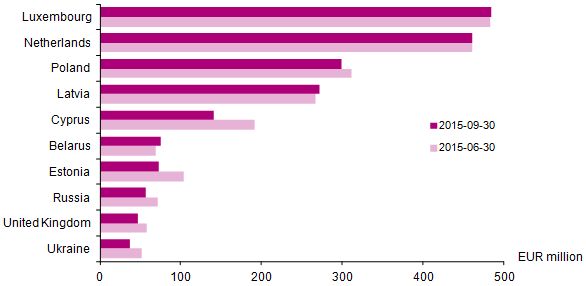 According to the data of 30 September 2015, the largest investment was made in Luxembourg – EUR 485.2 million (23.2%), the Netherlands – EUR 461.3 million (22.1%), Poland – EUR 298.9 million (14.3%), Latvia – EUR 271.7 million (13%), Cyprus – EUR 141.5 million (6.8%), Belarus – EUR 75.3 million (3.6% of the total Lithuanian DI abroad). Lithuanian cumulative DI to the EU member states amounted to EUR 1.9 billion (90.7%), to the euro area counties – EUR 1.5 billion (70.7%), to the CIS countries – EUR 172.5 million (8.3% of the total Lithuanian DI abroad).