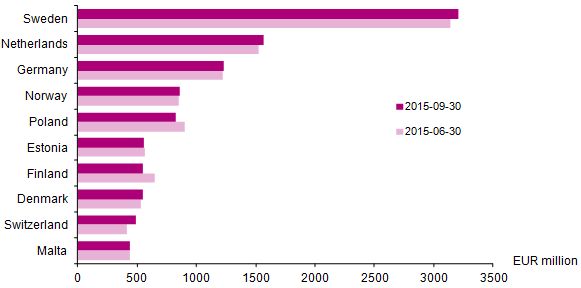 In III quarter 2015, the largest increase was observed in FDI from Sweden (EUR 57.6 million), the United Kingdom (EUR 47.5 million) and Finland (EUR 34.3 million), while decrease – Poland (minus EUR 71.7 million), Luxembourg (minus EUR 24.8 million) and France (minus EUR 22.4 million).