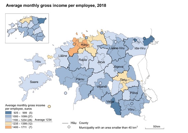 In approximately a quarter of the municipalities, employees earned more than the Estonian average monthly gross income. Similarly to previous years, the top ten included mainly the municipalities of Harju county. The average monthly gross income was highest in Viimsi (1,711 euros) and Rae (1,704 euros) rural municipalities. In Tallinn, the average gross income per month was 1,348 euros. The gross income was below 1,000 euros in four cities of Ida-Viru county (Narva, Kohtla-Järve, Sillamäe and Narva-Jõesuu) and in Valga rural municipality.