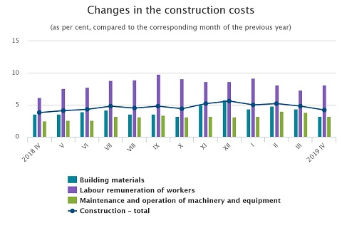Compared to April 2018, construction costs rose by 4.2%. Labour remuneration of workers grew by 8.1%, prices of building materials and maintenance and operational costs of machinery and equipment – by 3.2%.