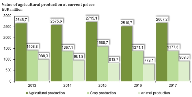 In 2017, the agricultural value added at current prices totalled EUR 1.05 billion, or by 5.7% more than in 2016.