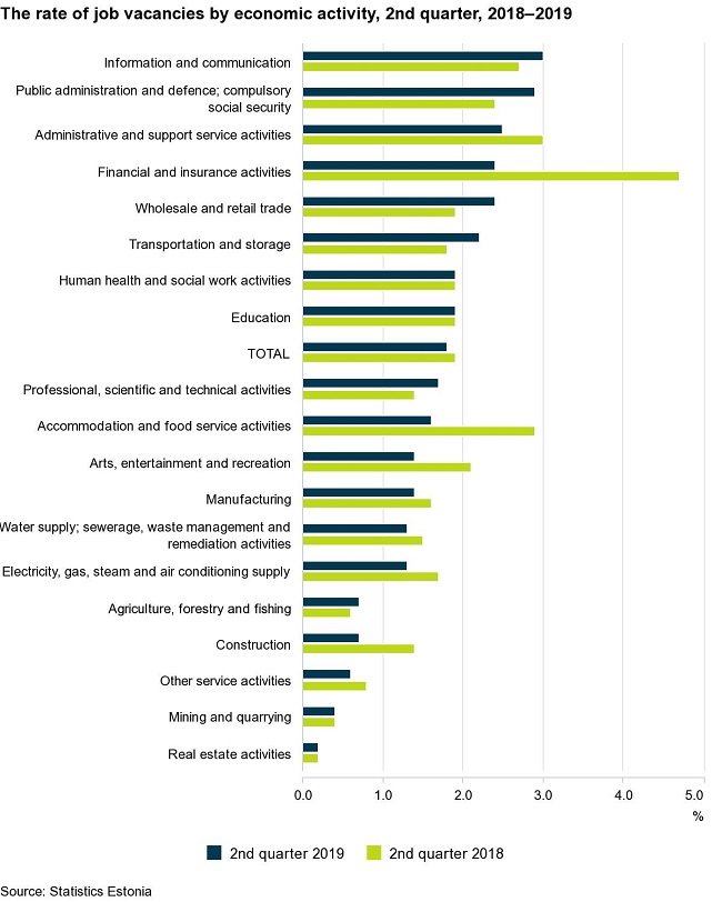 The rate of job vacancies, i.e. the share of job vacancies in the total number of posts, was 1.8% in the 2nd quarter of 2019, which is 0.1 percentage points lower than in the 2nd quarter of 2018. The rate of job vacancies was highest in information and communication (3.0%) and in public administration and defence (2.9%), but lowest in mining and quarrying (0.4%) and real estate activities (0.2%).