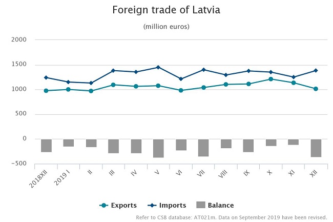 December, Latvia exported goods in the amount of EUR 1.01 bn, but