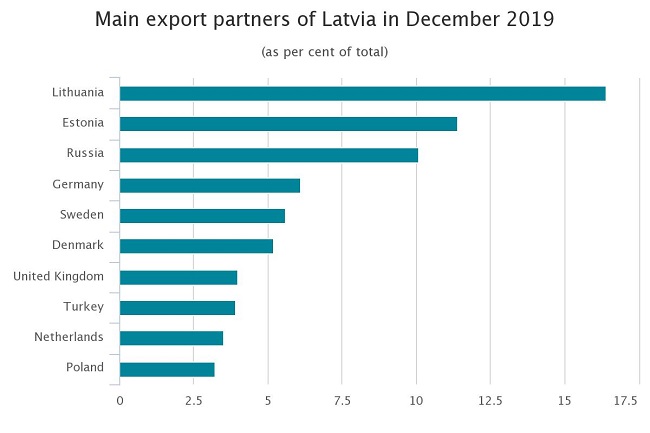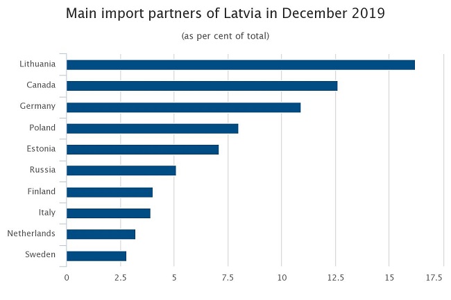 Latvian exports in December accounted for 10.1%, whereas Canada was the main