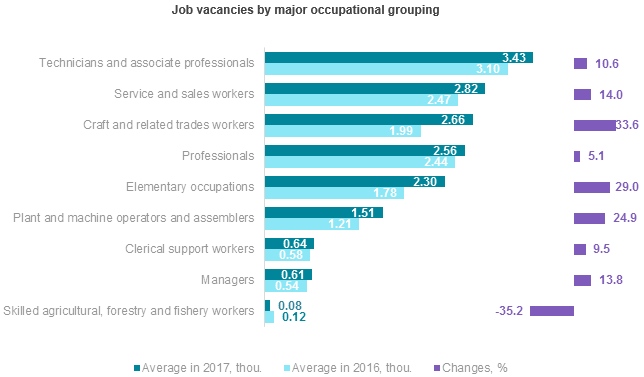 In 2017, the highest share of job vacancies in the total number of jobs within the respective occupational grouping was recorded in public administration and defence, compulsory social security (4.6%), manufacturing and construction (2.3% in each), human health and social work activities (2.2%), as well as water supply; sewerage, waste management and remediation activities (2.1%).In transportation and storage, accommodation and food service activities, information and communication, as well as financial and insurance activities the share of job vacancies was comparatively high – 2.0%.