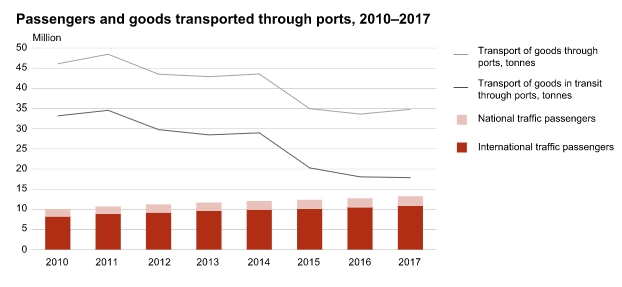 Transit goods were loaded and unloaded in ports in the amount of 17.9 million tons, which is 1% less than in 2016. Around 12.7 million tons of transit cargo was loaded and 5.1 million tons unloaded at Estonian ports. The most frequently handled group of transit goods at Estonian ports was refined petroleum products, which totaled 11.4 million tons, although the transport of these products decreased by 5% on year.