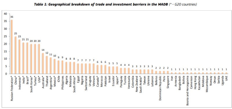 The report also shows that 67 new barriers were recorded in 2017, taking the total tally of existing obstacles to a stark 396 between 57 different trading partners around the world. This confirms the worrying protectionist trend identified in previous years. China displayed the largest increase in new barriers in 2017, followed by Russia, South Africa, India and Turkey. The Mediterranean region also showed a notable rise in barriers for EU companies. The nine countries with the highest number of trade barriers still in place are all G-20 economies.