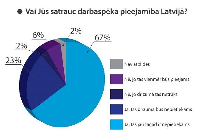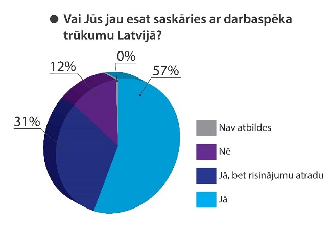 23% респондентов считают, что в ближайшее время они столкнутся с этой проблемой, а только 8% указали на ее отсутствие. “С прошлой осени, когда был проведен первый такой опрос, и со второго в марте, растет число не только тех предпринимателей, кто озабочен проблемой, но и тех, кто уже столкнулся с заполнением вакансий. Это серьезный сигнал политикам к принятию мер для интеграции разных групп населения в рынок труда и других решений для того, чтобы бизнес мог развиваться”, -- говорит председатель LTRK Янис Эндзиньш.