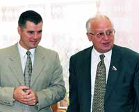 Viktor Glukhikh (on right) and Gintaras Skobas discuss issues of cooperation | Viktor Glukhikh was born in 1946. From 1966 to 1990 he worked in the Leningrad Metallurgy Plant, where he passed the way from turner to chief engineer, to the first deputy of the director general. In 1989 he graduated the academy of national economy, in 1990 he was nominated as the first deputy minister of industry for the Russian Federation, in October 1992 - as chairman of the committee on defense of industry sectors. In May 1996 Glukhikh was elected president of the International Congress of Industrialists and Entrepreneurs - an international public organization. Since 1998 he is simultaneously the chairman of the board of directors at Rybinsky Motors (now called RPA Saturn). He is a member of the board of the Russian Union of Industrialists and Entrepreneurs. In 2001 he was elected a member of the council of the Russian Federation's Federal Assembly from the Yaroslavskaya region. He is a permanent representative on the federative council for the government of the Russian Federation. He is a Doctor of technical sciences, an academic of Russian and International engineering academies. The winner of prizes from the Russian government, titled as an Honorary industrial engineer of the Russian Federation. He is married with a son and daughter.