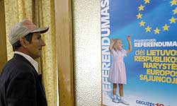 The decision of the Lithuanian people voting overwhelmingly in favor of joining the European Union (EU) was cheered by Lithuanian President Rolandas Paksas on May 20 in the White Hall of the Presidential residence accompanied by Beethoven’s Symphony no.9 and final chorus from Schiller’s “Ode to Joy”. The turnout in the EU referendum on May 10-11 reached 63.3% of the registered voters, out of which 89.92% (nearly 1.498 million people) voted in favor of “a bright future within the EU”. The referendum gives the President the popular mandate needed to ratify country’s treaty with the EU, signed at an Athens summit meeting in April 2003.