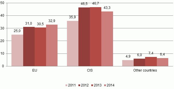 In 2014 dispatches of prepared and preserved fish products to the European Union (EU) countries reached 32.9 mln euros or 39.9% of the total exports value of prepared and preserved fish products. Exports to CIS countries compried 43.3 mln euros or 52.4%, but to other countries – 6.4 mln euros or 7.7%.
