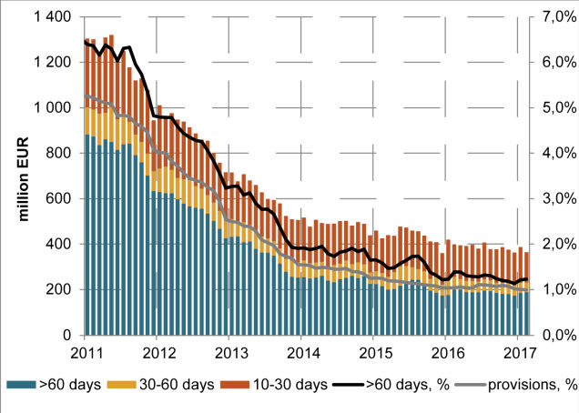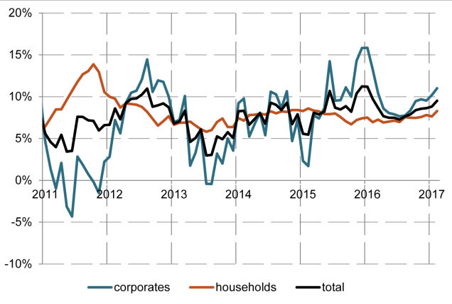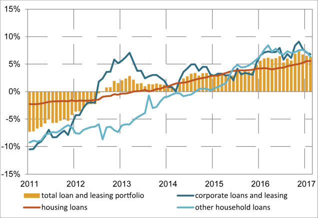 The housing loan portfolio grew at a pace similar to January, gaining 5.6% y-o-y as at the end of the month. 76 mln euros worth of new housing loans were issued in February, up around 10% year-on-year. Lending increased in terms of the number of contracts as well as the average value of contracts. Albeit slowing down somewhat during the first months of 2017, car leasing continues to grow at a fast pace (up 14% in February year-on-year). Overdraft and credit card loans rose 1.2% in February compared to a year earlier.