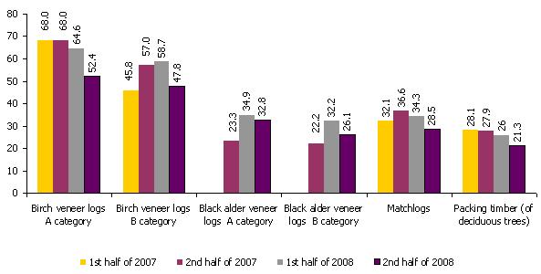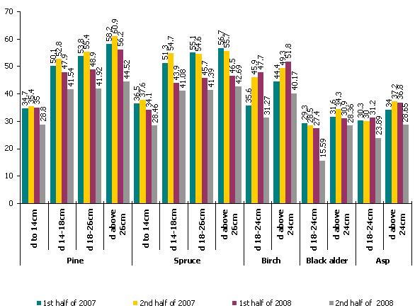 Print versionTo compare purchase prices of round timber in 2008 and in 2008 it should be noted that, purchase prices of pine sawlogs on average reduced by 8-16%, of spruce sawlogs – by 19-29%, of deciduous sawlogs – on average by 15%. The reduction of birch veneer log purchase prices constituted 11%, prices of matchlogs decreased by 6%, and of packing case timber – by –16%. The only price growth was recorded in purchase prices of black alder veneer logs – 17-40%.