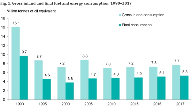 In 2017, gross inland fuel and energy consumption amounted to 7.67 mln tonnes of oil equivalent in Lithuania