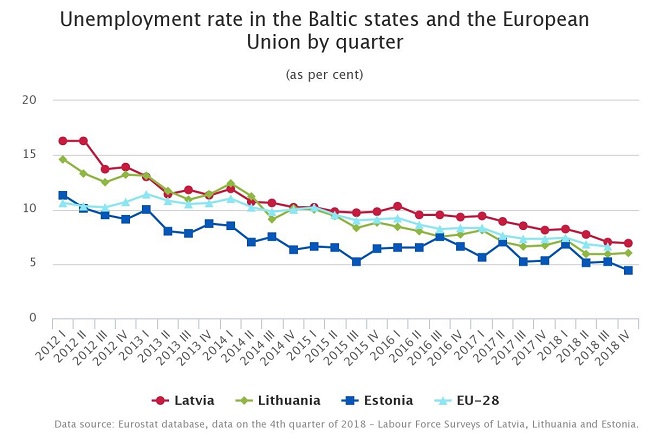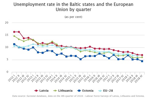 Since the 3rd quarter of 2008, Latvian unemployment rate exceeds the European Union (EU) average (except for the 1st quarter of 2015 when both indicators were equal). In the 3rd quarter of 2018, Latvian unemployment rate (constituting 7.0%) exceeded the EU average (6.6%) by 0.4 percentage points. In the 4th quarter, Latvia still had the highest unemployment rate in the Baltic states (6.9%), compared to 4.4% in Estonia and 6.0% in Lithuania.