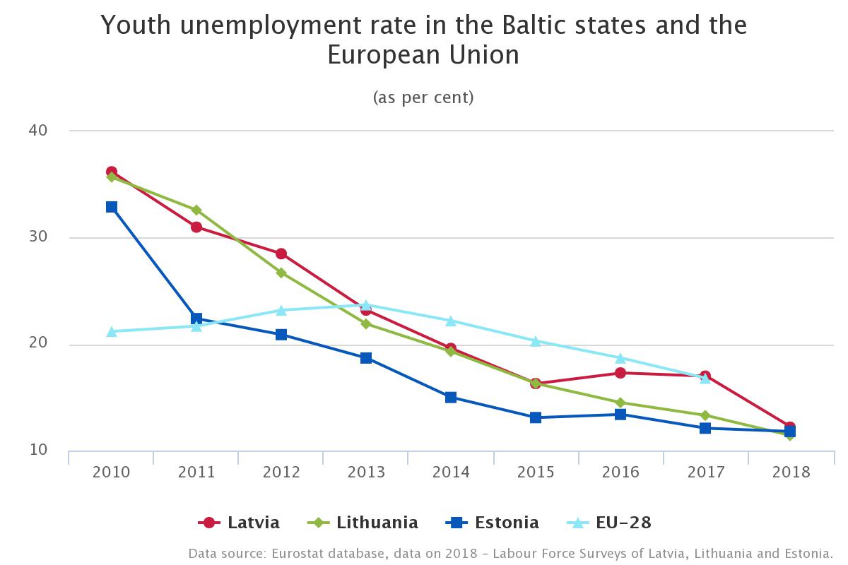 From 2013 to 2016, Latvian youth unemployment rate was lower than the EU average, however in 2017 it constituted 17.0% and was 0.2 percentage points higher than the EU average (16.8%). In 2018, Latvia still had the highest youth unemployment rate in the Baltic states, compared to 11.4% in Lithuania and 11.8% in Estonia.