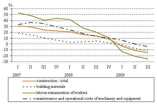 Compared to 3rd quarter of 2008, construction costs in 3rd quarter of 2009 on average decreased by 14.4%. Most rapid reduction (by 25.4%) among the main resource groups was observed in the labour remuneration of workers. Prices of building materials reduced by 11.1%, but maintenance and operational costs of machinery and equipment - by 4.8%. Reduction of construction costs in the construction of transport facilities, as well as in the reconstruction and construction of industrial, agricultural and trade buildings had the greatest lowering impact on overall level of construction costs.