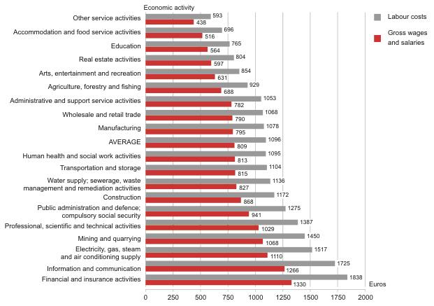 In the 3rd quarter of 2011, the employer’s average monthly labour costs per employee were 1,096 euros and the average hourly labour costs were 7.64 euros. Compared to the 3rd quarter of 2010, the average monthly labour costs per employee increased by 6.7% and the average hourly labour costs by 4.1%.