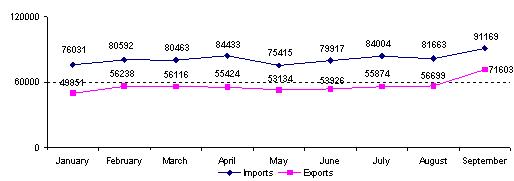 Compared to January – September 2007 the imports of agricultural and food products (at current prices) in January – September 2008 increased by 17.8% (share in total imports 12.9%), of which the imports of food products, alcoholic and non-alcoholic beverages and tobacco products – by 9.0%.
