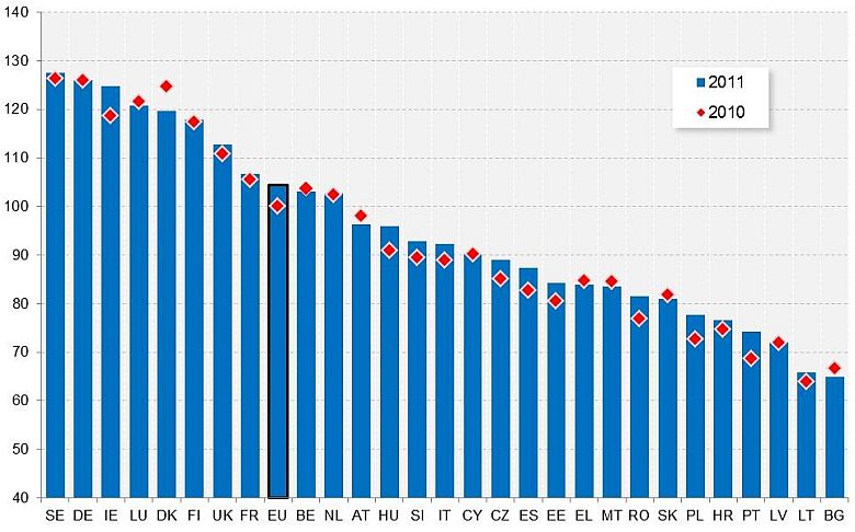 The indicator, which was developed at the request of EU leaders to benchmark national innovation policies, also showed that significant differences remain between EU countries with Bulgaria, Lithuania and Latvia getting the lowest score on the indicator, only around half of the top score.