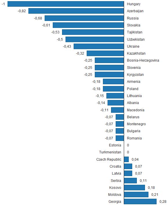 The Freedom House report on the development of democracy in post-communist countries highlights the recent setbacks in the governance of Eurasian, Balkan and Central European countries. Among the 29 states rated in 2013, only 13 countries had democratic governance, including in Estonia; six countries are still in a transitional phase, and 10 countries have authoritarian regimes.