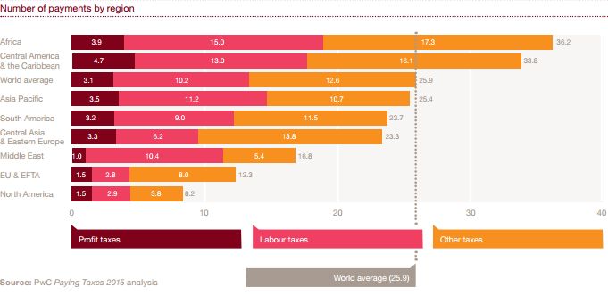 Reforms continue to be made in Africa, while progress is less evident in South America. South America now has the highest average time to comply and Total Tax Rate.