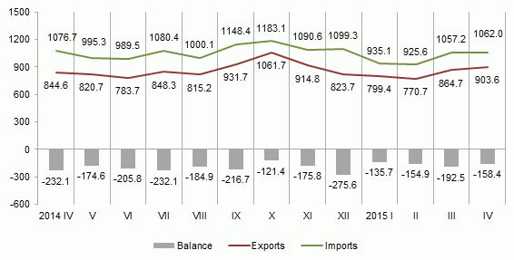 In April foreign trade balance slightly improved as exports in total foreign trade value increased to 46.0% (in March 2015 – 45.0%).