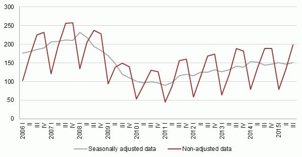 In the 3rd quarter of 2015 as compared to the 2nd quarter of this year construction production volume according to seasonally adjusted data at constant prices increased by 2.7%; of which construction of buildings – by 1.4% and construction of civil engineering structures – by 3.5%.