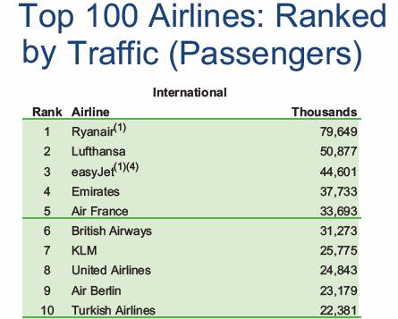 Ryanair carried 79.6m international passengers last year, almost 29m more than second-placed Lufthansa (50.8m) and 35m more than third-placed EasyJet (44.6m).