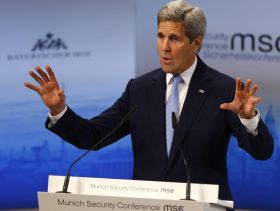 In a speech at the Munich Security Conference, Kerry said Russia is defying the will of the international community with its support for separatists in eastern Ukraine and its military intervention in Syria on behalf of President Bashar Assad.