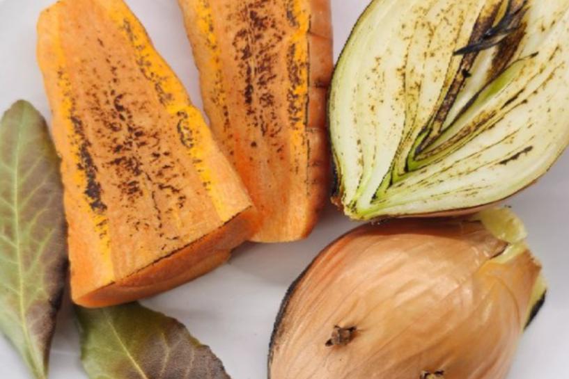 Kamēr gaidām putas, es sagatavoju dārzeņus buljonam. Nelielu sīpolu, pusi burkāna (nemizotus) un lauru lapu apdedzinu ar degli līdz vieglam apdegumam. Pateicoties tam, buljons iegūst patīkamu garšu un skaistu krāsu. Var apcept arī pannā vai cepeškrāsnī.