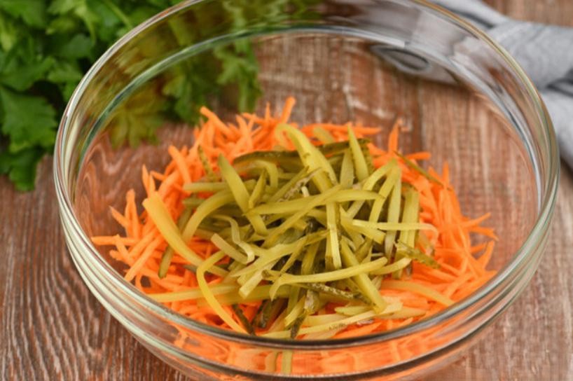 1. Salāti no svaigiem burkāniem un marinētiem gurķiem