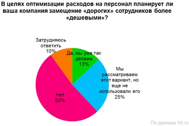 Интересно отметить, что 13% работодателей в целях оптимизации расходов на персонал используют практику замещения «дорогих» сотрудников дешевыми. Еще четверть рассматривают этот вариант, но пока не использовали его.