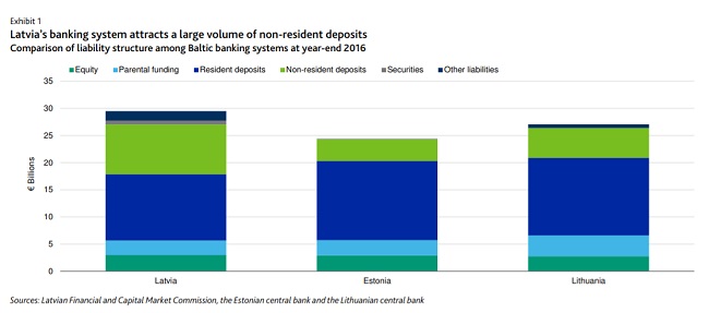 Moody's отмечает, что около 30% обязательств латвийской банковской системы составляют депозиты международных нерезидентов - это значительно больше, чем в двух других странах Балтии, что делает банковскую систему Латвии уязвимой к негативному внешнему влиянию.