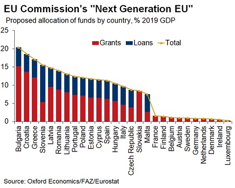 Всего ЕС выделил бы помощь в размере 405 млрд. евро, из этой суммы 28,8 млрд. евро получила бы Германия, а 38,7 млрд. евро Франция.