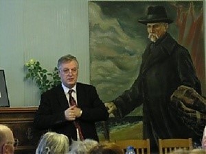 | Посол Украины в Латвии Рауль Чилачава во время презентации в Риге своей книги «Райнис и Аспазия. Трехцветное солнце» на фоне портрета Райниса. |