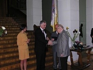 | 2008 год. Президент Академии наук Латвии Янис Страдиньш вручает Раулю Чилачава престижный приз Цицерона в области международной политики - за выдающийся вклад в развитие латвийско-украинских отношений. |
