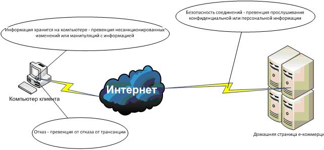 Безопасность клиентской части это безопасность персонального компьютера клиента во время эго соединения с сервером электронной коммерции. Эта часть системы включает в себя компьютер клиента, интернет браузер, а так же само соединение с сервером.