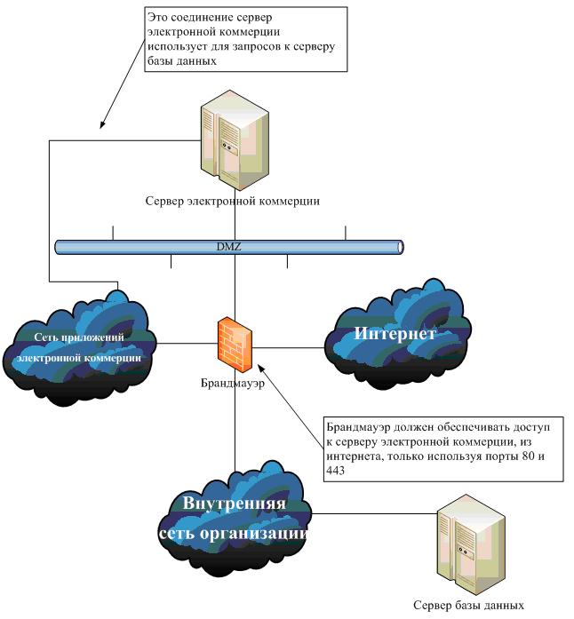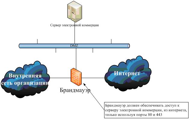 На „Рисунок 2 Правильное расположение сервера электронной коммерции в сети” отображено размещение сервера в демилитаризованной зоне (DMZ). Брандмауэр должен быть правильно сконфигурирован позволяя подключаться к серверу только используя порта 80 (для HTTP) и 443 (для HTTPS). Для открытого доступа к серверу не нужны дополнительные сервисы, соответственно их необходимо блокировать на брандмауэре.