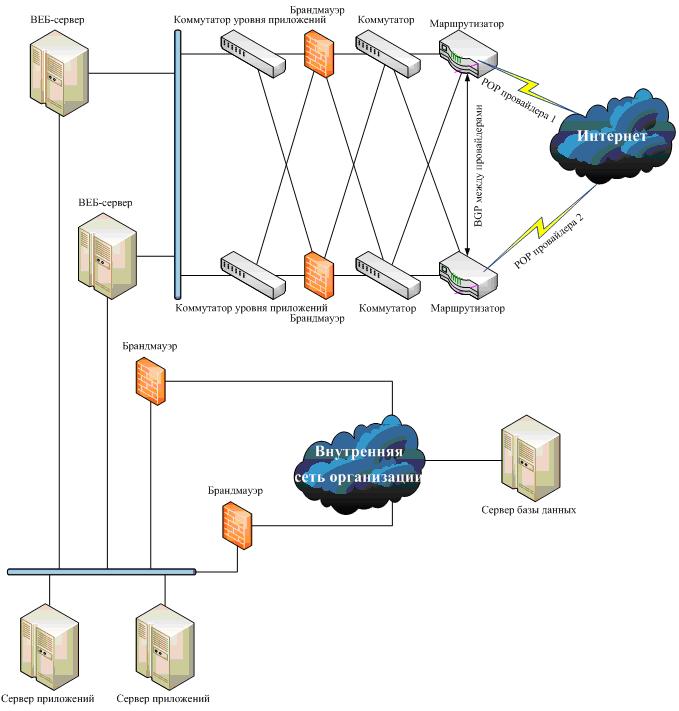 Расположение сервера и соединенияРассматривается портал с большой степенью доступности и большим объёмом обрабатываемого трафика. В организации обеспечен выход в интернет используя услуги двух независимых провайдеров, к тому же с ними заключен договор об использовании протокола BGM (Border Gateway Protocol) для обеспечения безотказной маршрутизации. Допустим, что организация решила разместить свои сервера электронной коммерции в одном помещении.